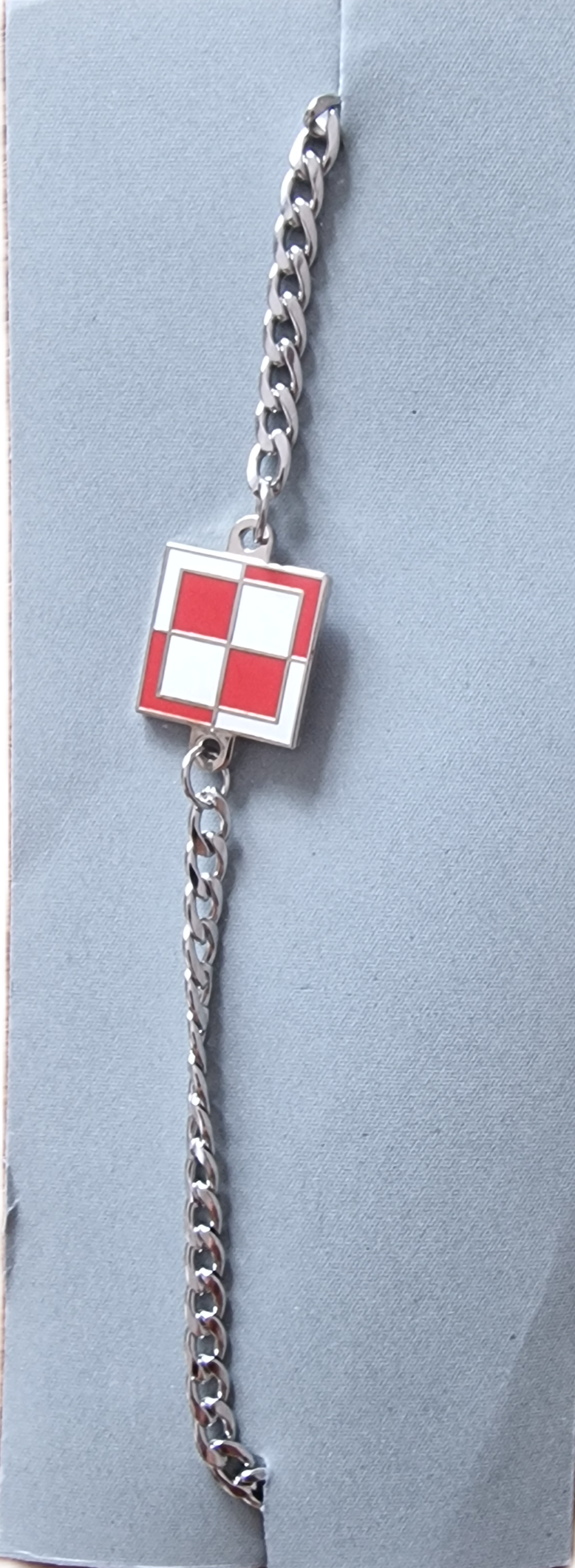 Bransoletka wykonana ze stali chirurgicznej biało-czerwona szachownica o wymiarach 1,5 cm.